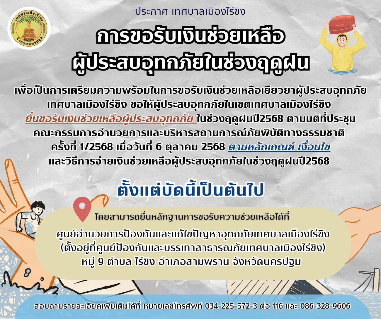 ภาพที่เกี่ยวข้อง การขอรับเงินช่วยเหลือผู้ประสบอุทกภัยในช่วงฤดูฝน ปี 2568 ในเขตเทศบาลเมืองไร่ขิง
